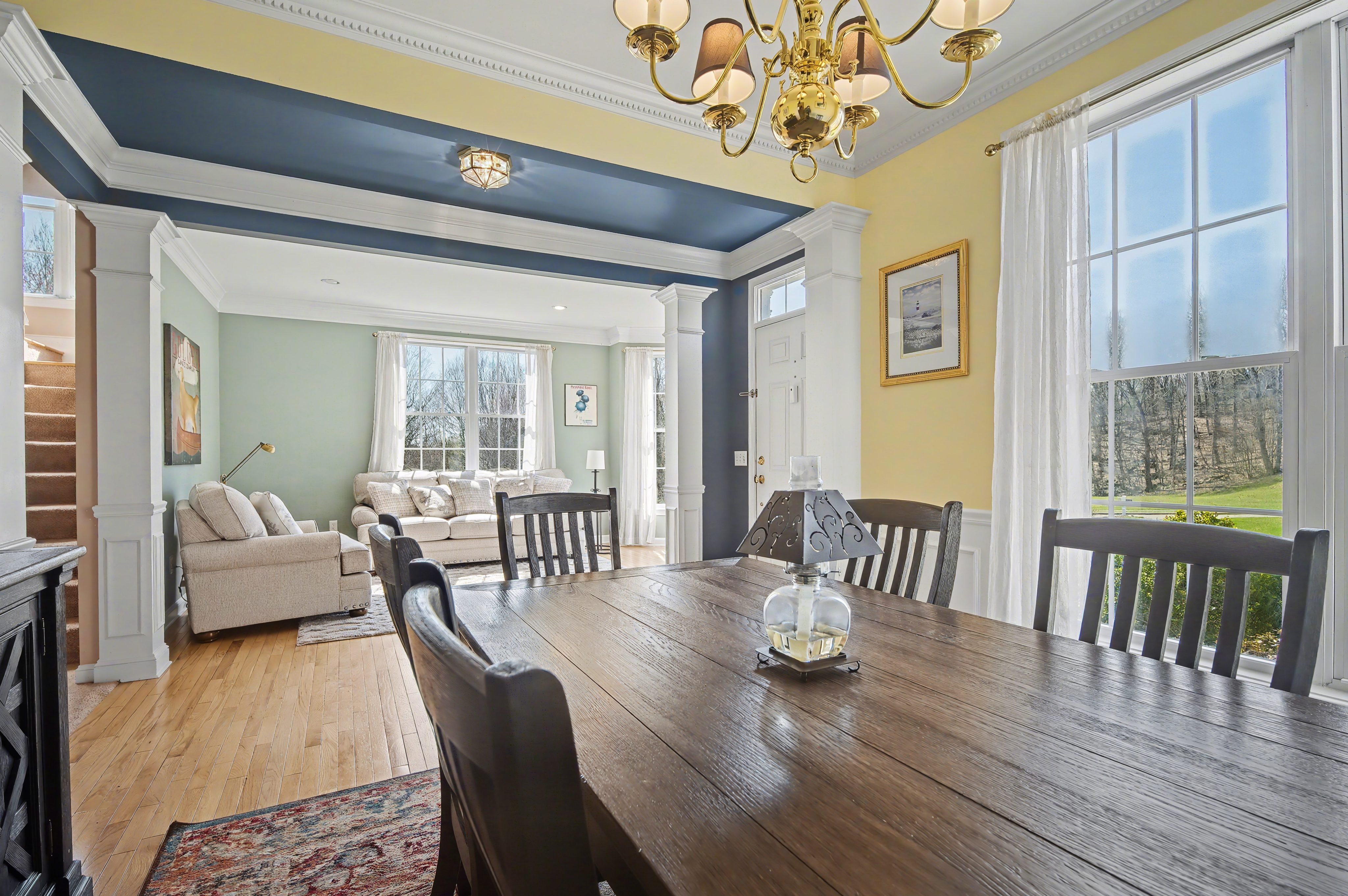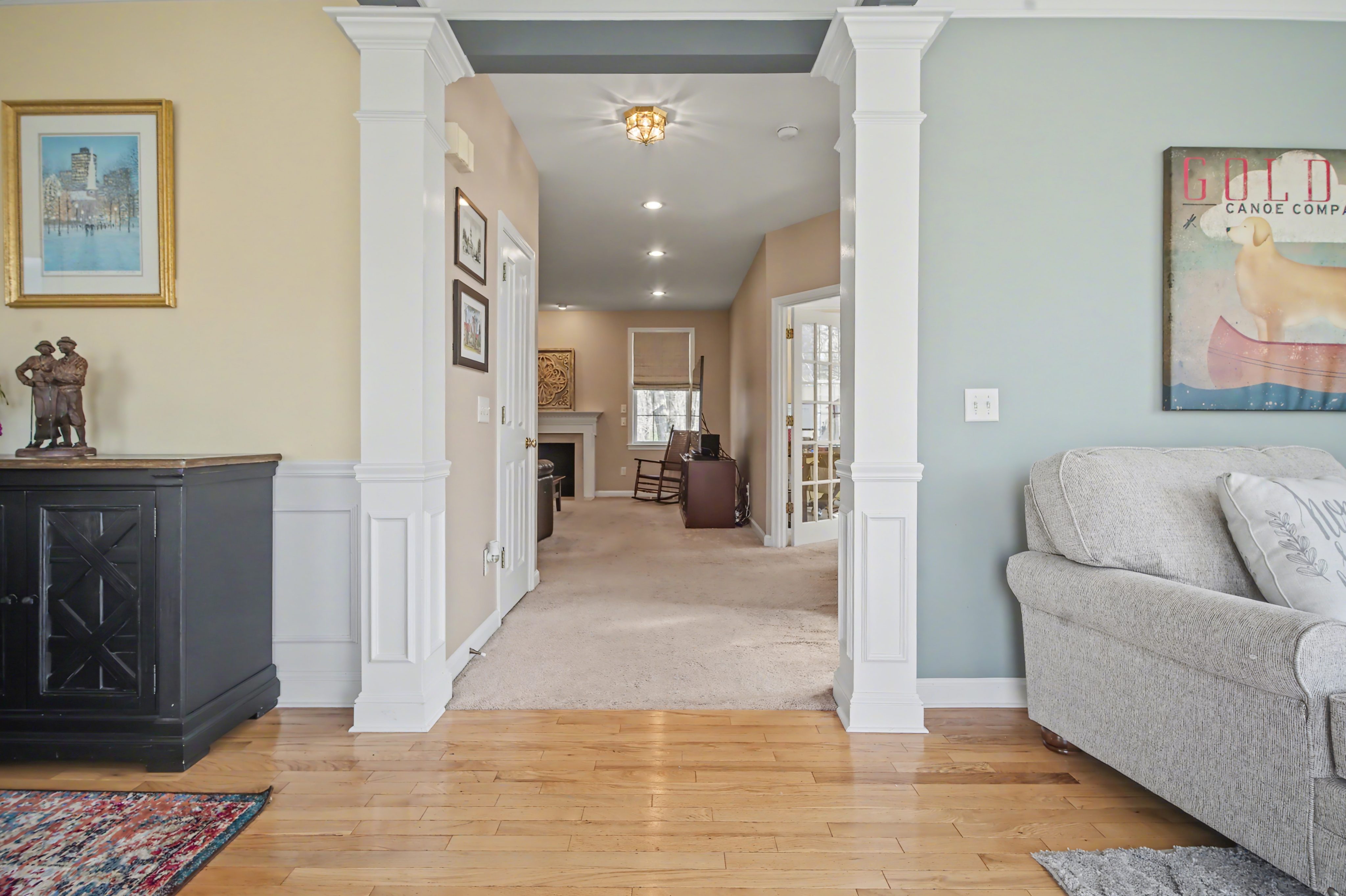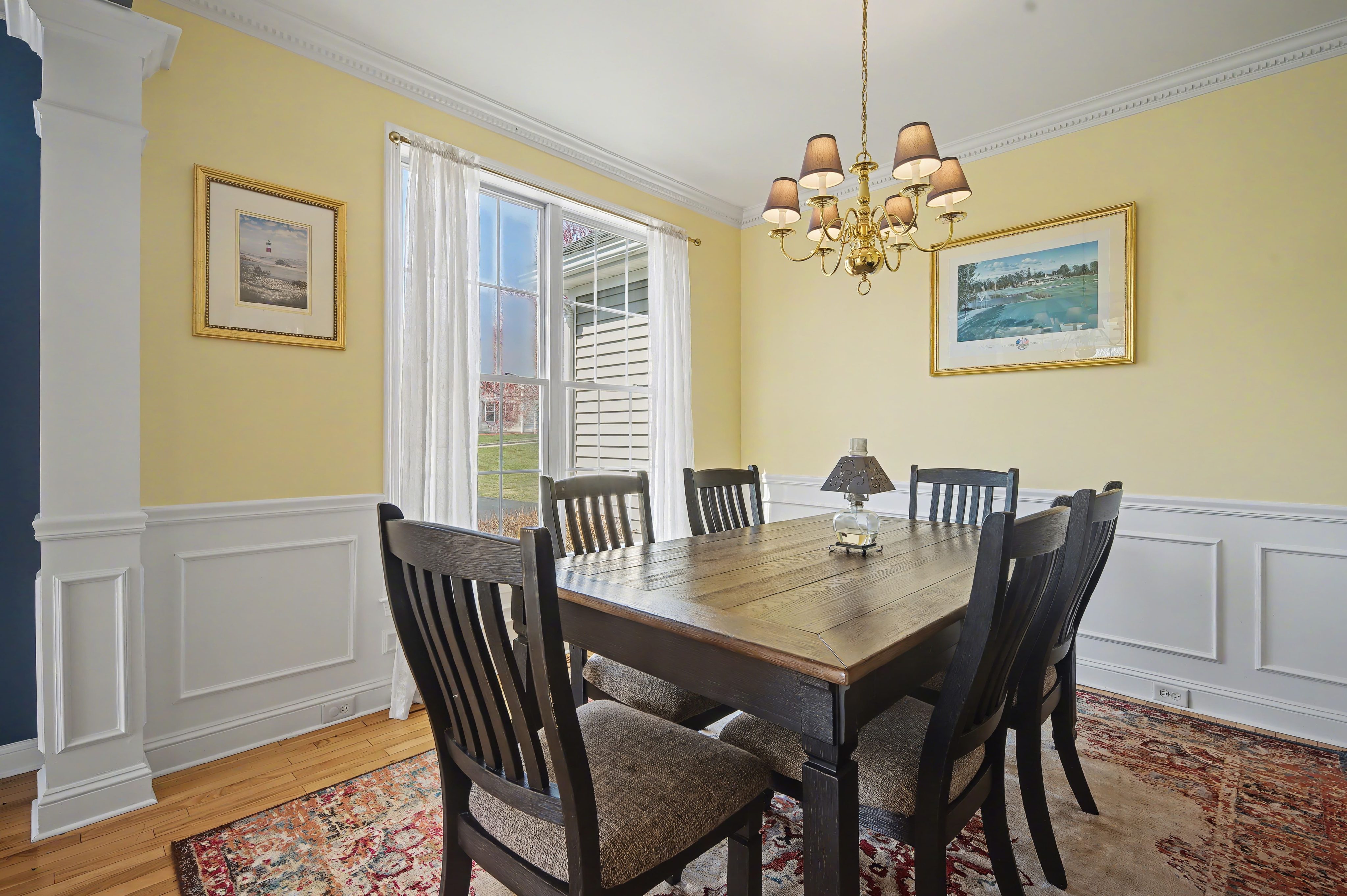 dining and living rooms with wainscot